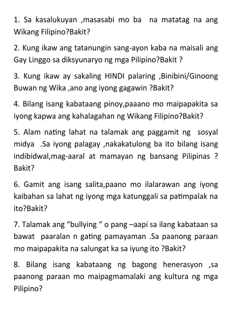 Naimpluwensiyahan man ng ibang kultura ang ating. Hindi magiging mahirap ang pag-aangat ng estado ng ekonomiya kung gagamitin natin ang wikang Filipino kagaya ng ginawa ng ibang bansa na ginamit lamang ang sarili nila upang maging isang maunlad na bansa. 29032019 Ayon kay Wilcamor Pacay III Karapatan ng mga mamamayan na matutunan ang Wikang Filipino at obligasyon ng gobyerno na ituro ito sa mga mamamayan Ang ating wika ay mahalaga sa kultura ng ating bansa.