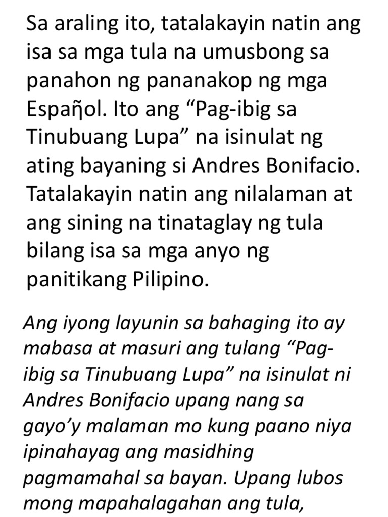 Ipinapahiwatig ng sanaysay na ito na ang pag-ibig sa ating bayan ay isang dahilan upang makagawa ng mga dakilang bagay gaya ng pag-aalay ng buhay para. Kalayaan Kamayaman ng BayanDisclaimer.